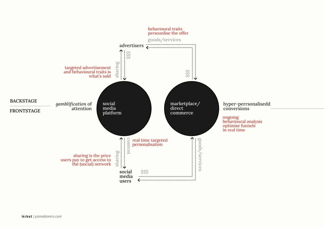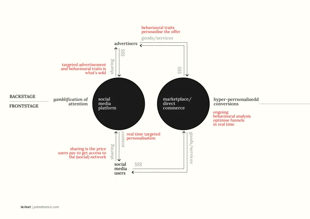 - Commodification of user attention. Social media platforms are designed to capture and retain user attention, while simultaneously extracting endless feeds of behavioural data to be packaged and sold—primarily for targeted advertising.