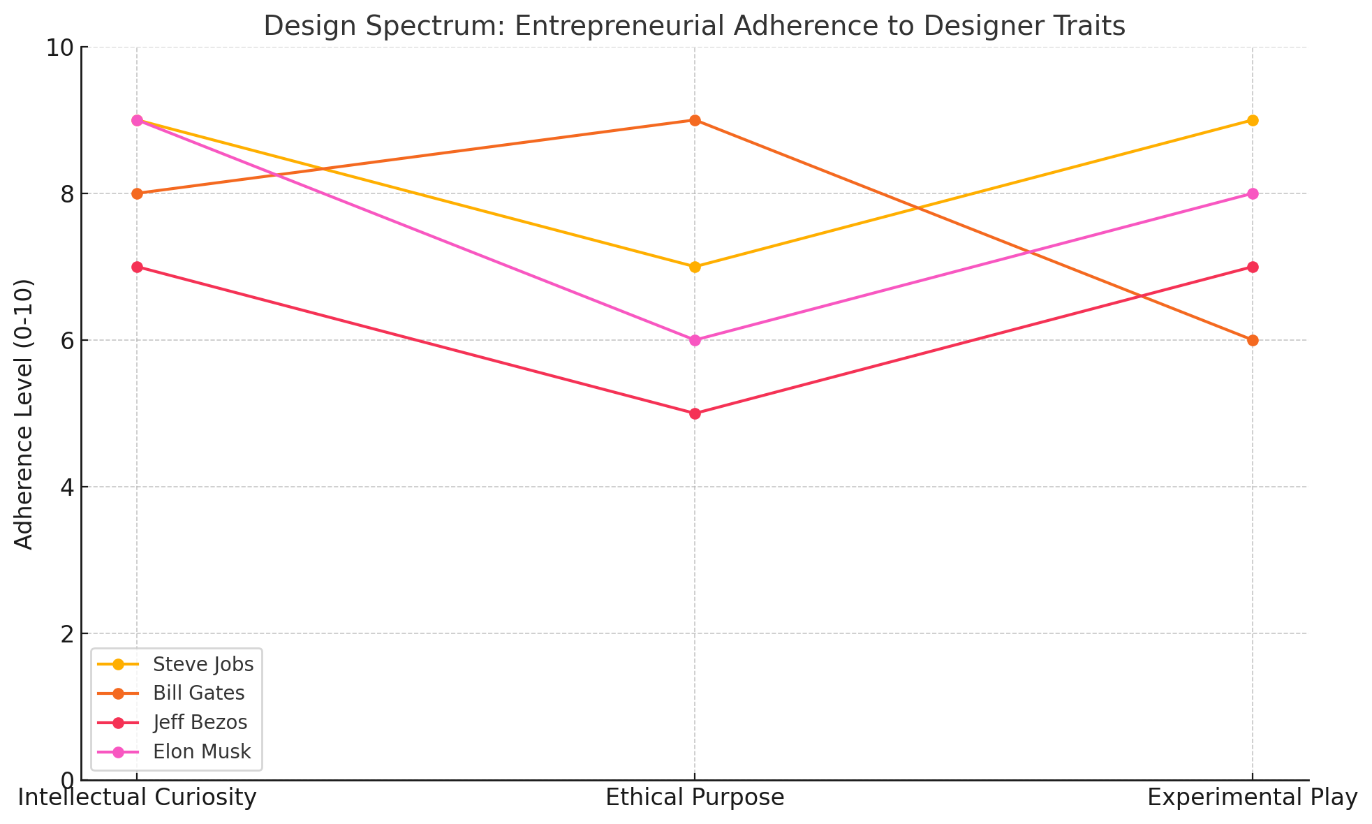 To measure the entrepreneurs Steve Jobs, Bill Gates, Jeff Bezos, and Elon Musk on the proposed Design Spectrum, I've evaluated their alignment with the three core traits of a Designer as defined: Intellectual Curiosity, Ethical Purpose, and Experimental Play. Each trait is scored on a scale of 0 to 10, and an aggregate score (the average of the three traits) determines their position on the spectrum, with higher scores indicating greater adherence to the Designer identikit. Below, I provide a graphical representation through a description of the plotted data and a structured reasoning for the scoring of each entrepreneur.